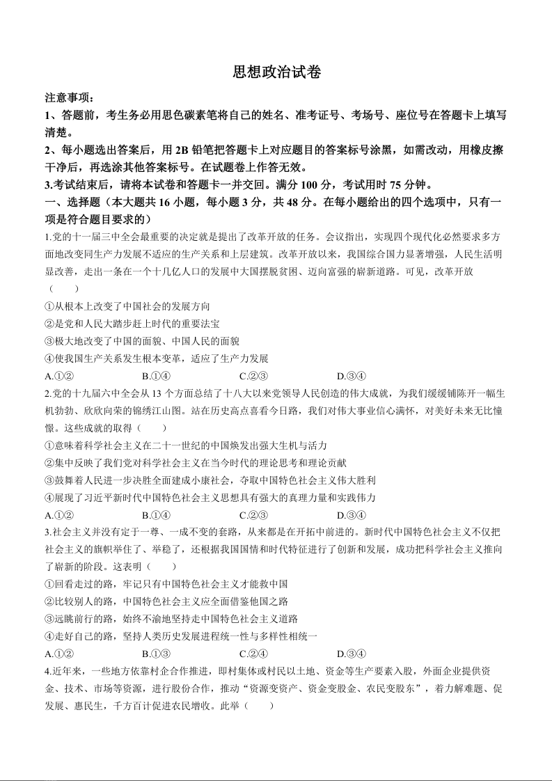 贵州省贵阳市第一中学2024届高三下学期一模考试政治