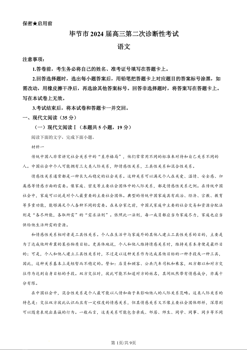 贵州省毕节市2024届高三下学期二模考试(毕节二模)语文(原卷版)