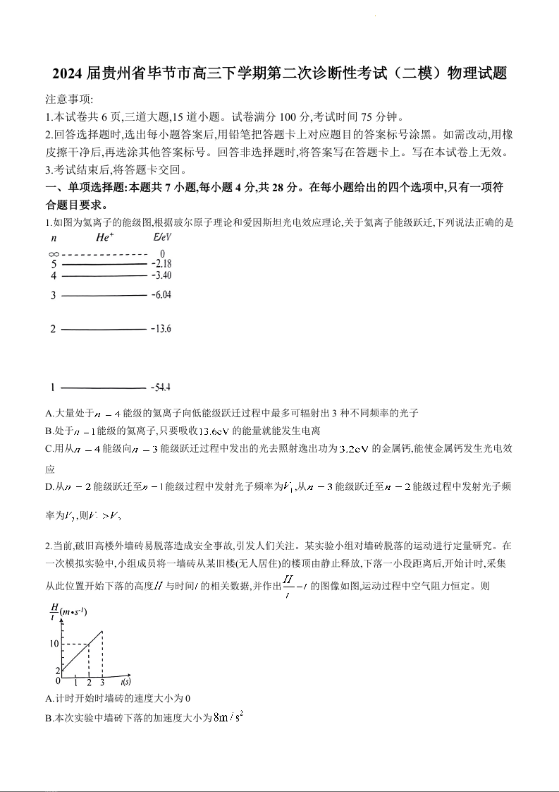 贵州省毕节市2024届高三下学期二模考试(毕节二模)物理+答案