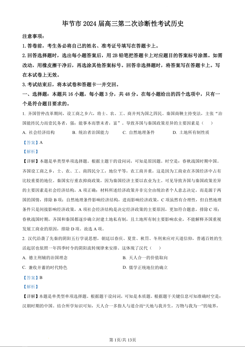 贵州省毕节市2024届高三下学期二模考试(毕节二模)历史(精品解析版)