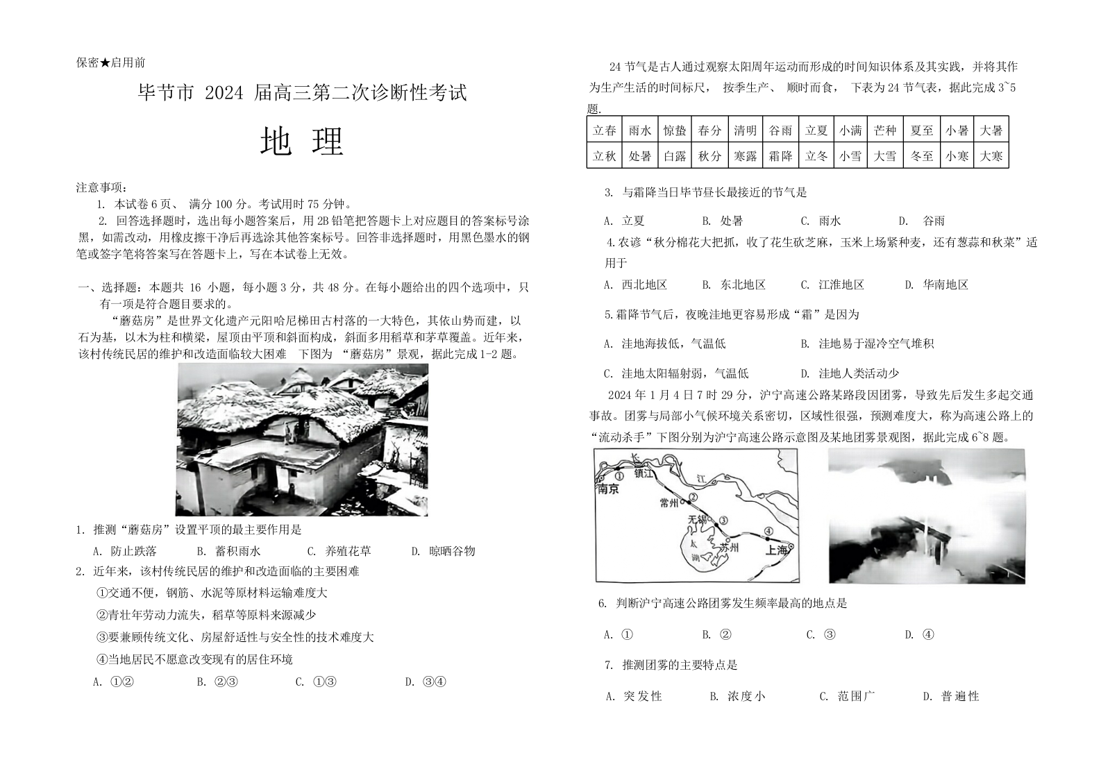 贵州省毕节市2024届高三下学期二模考试(毕节二模)地理