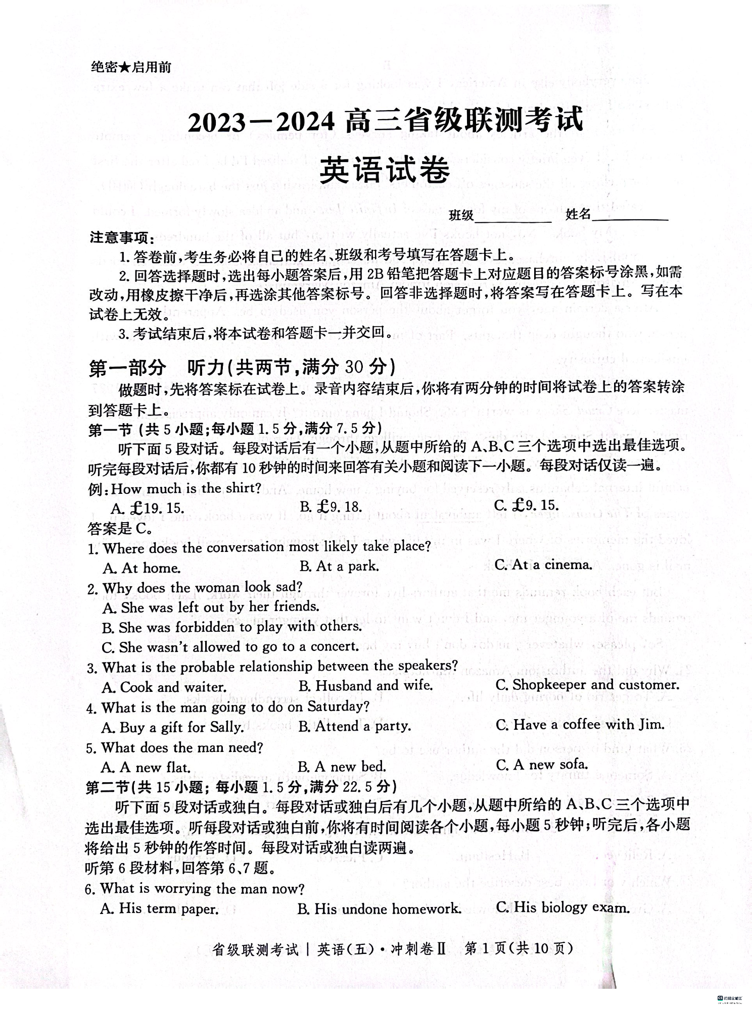 河北省2024届高三下学期省级联测考试(3月)英语+答案