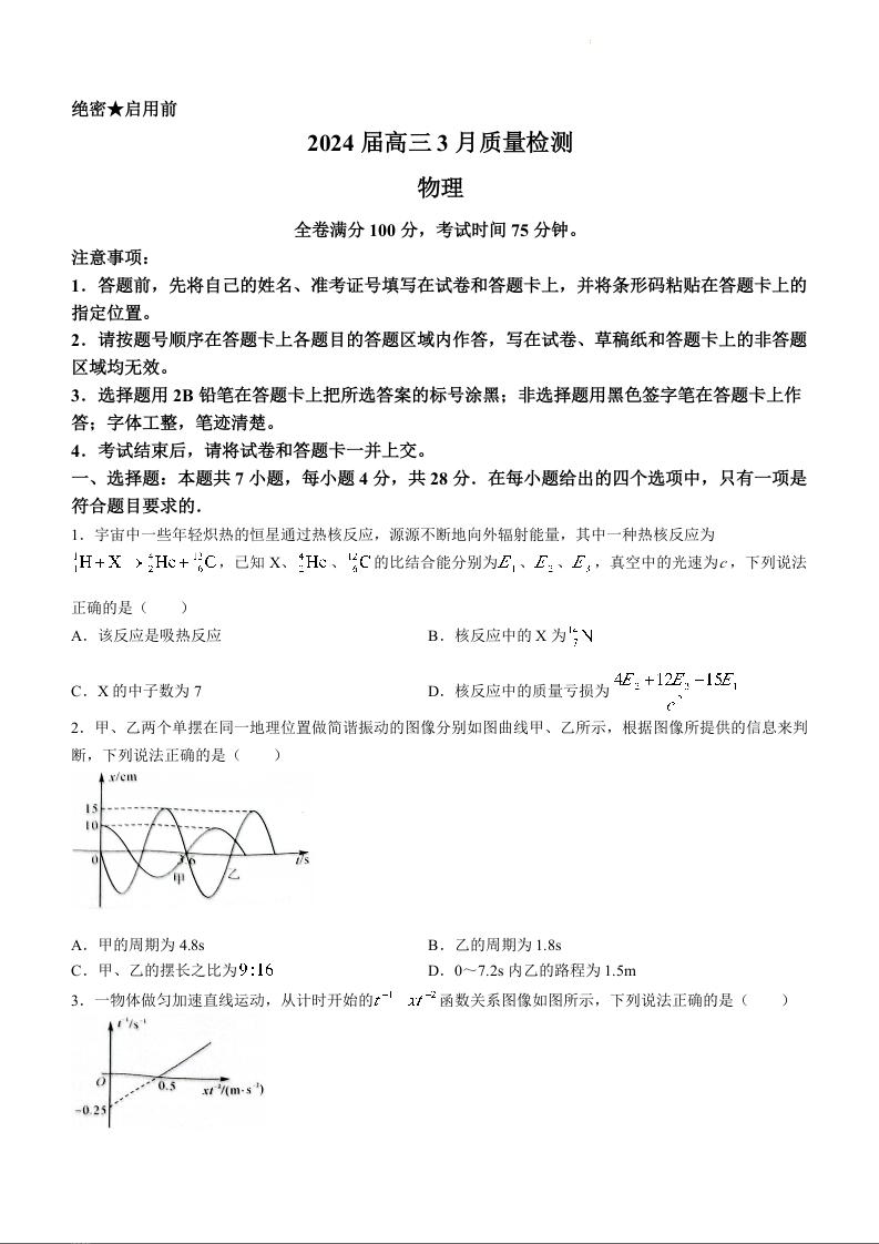 河北省金科大联考2024届高三下学期3月质量检测物理