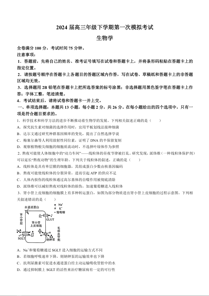 河北省金科大联考2024届高三下学期3月质量检测生物+答案