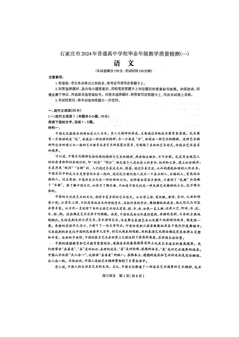 河北省石家庄市2024届普通高中学校毕业年级教学质量检测(一)语文
