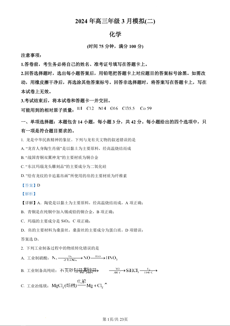 河北省石家庄市2024届普通高中学校毕业年级教学质量检测(一)化学(精品解析版)