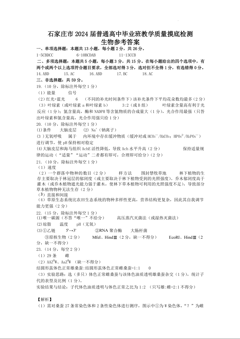 河北省石家庄市2024届普通高中学校毕业年级教学质量检测(一)生物答案