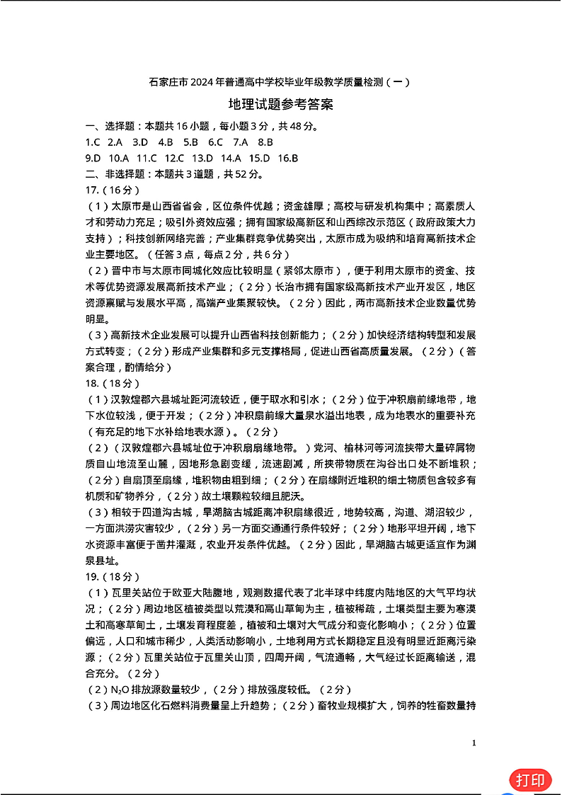 河北省石家庄市2024届普通高中学校毕业年级教学质量检测(一)地理答案