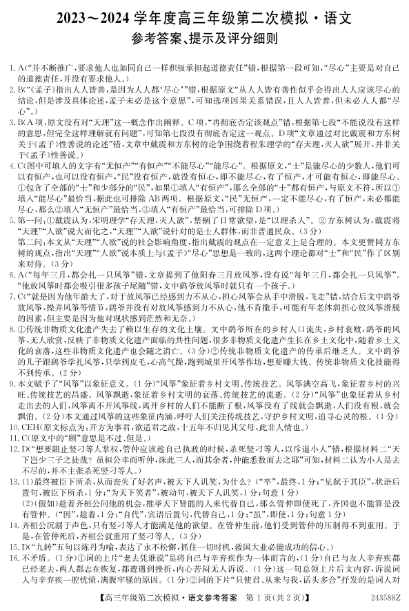 黑龙江省2024届部分学校高三下学期第二次模拟考试语文答案