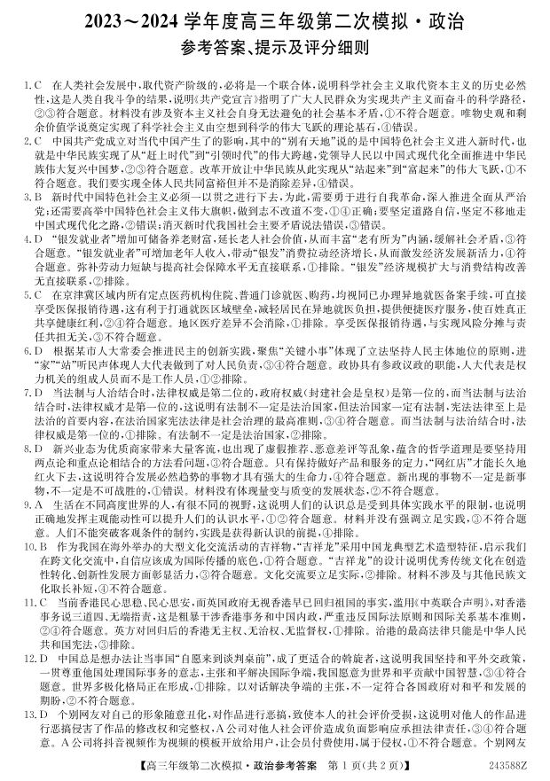 黑龙江省2024届部分学校高三下学期第二次模拟考试政治答案