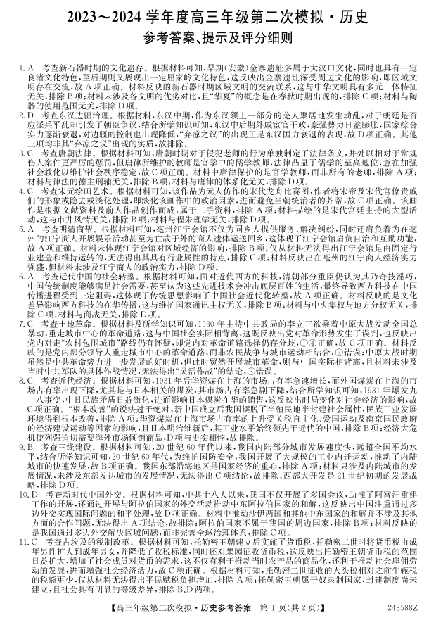黑龙江省2024届部分学校高三下学期第二次模拟考试历史答案
