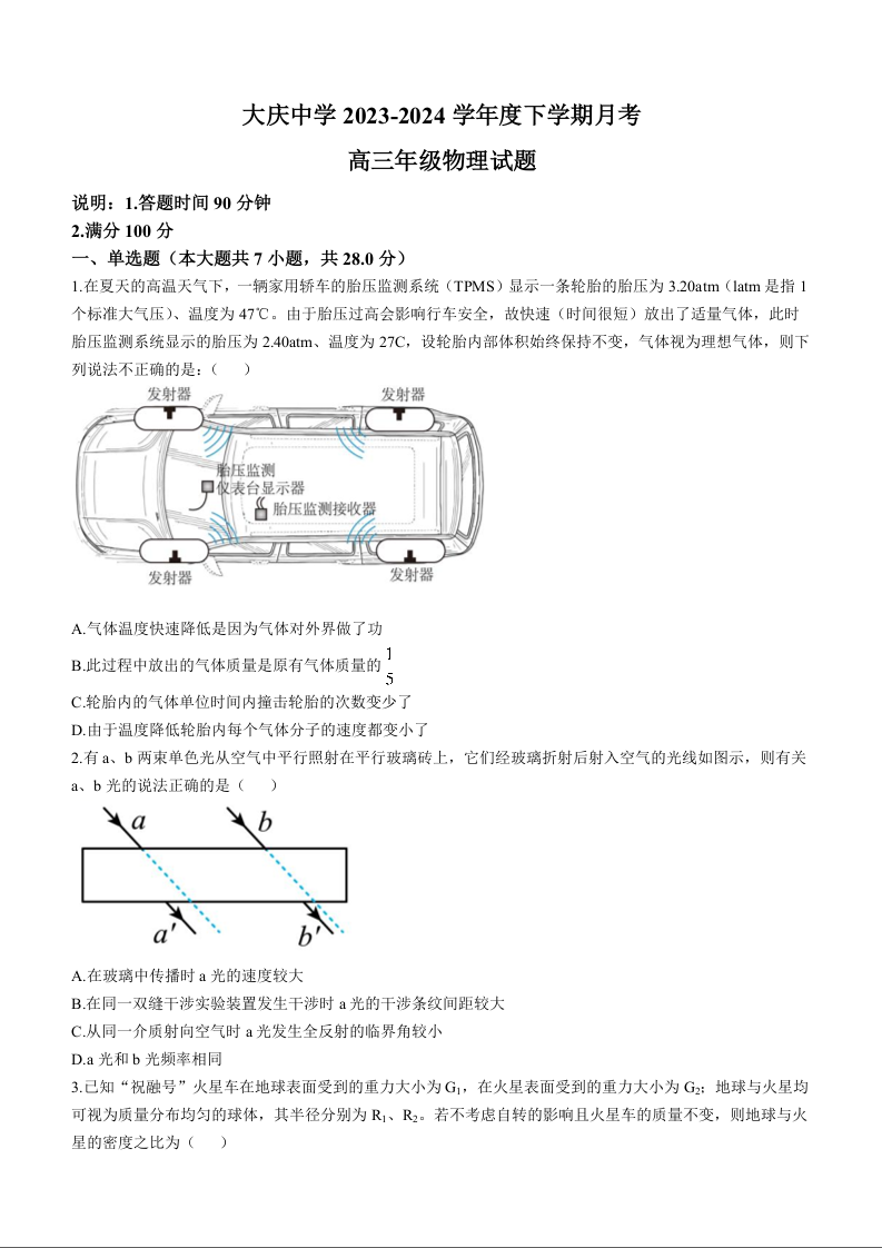 黑龙江省大庆市大庆中学2024届高三下学期开学考试物理+答案