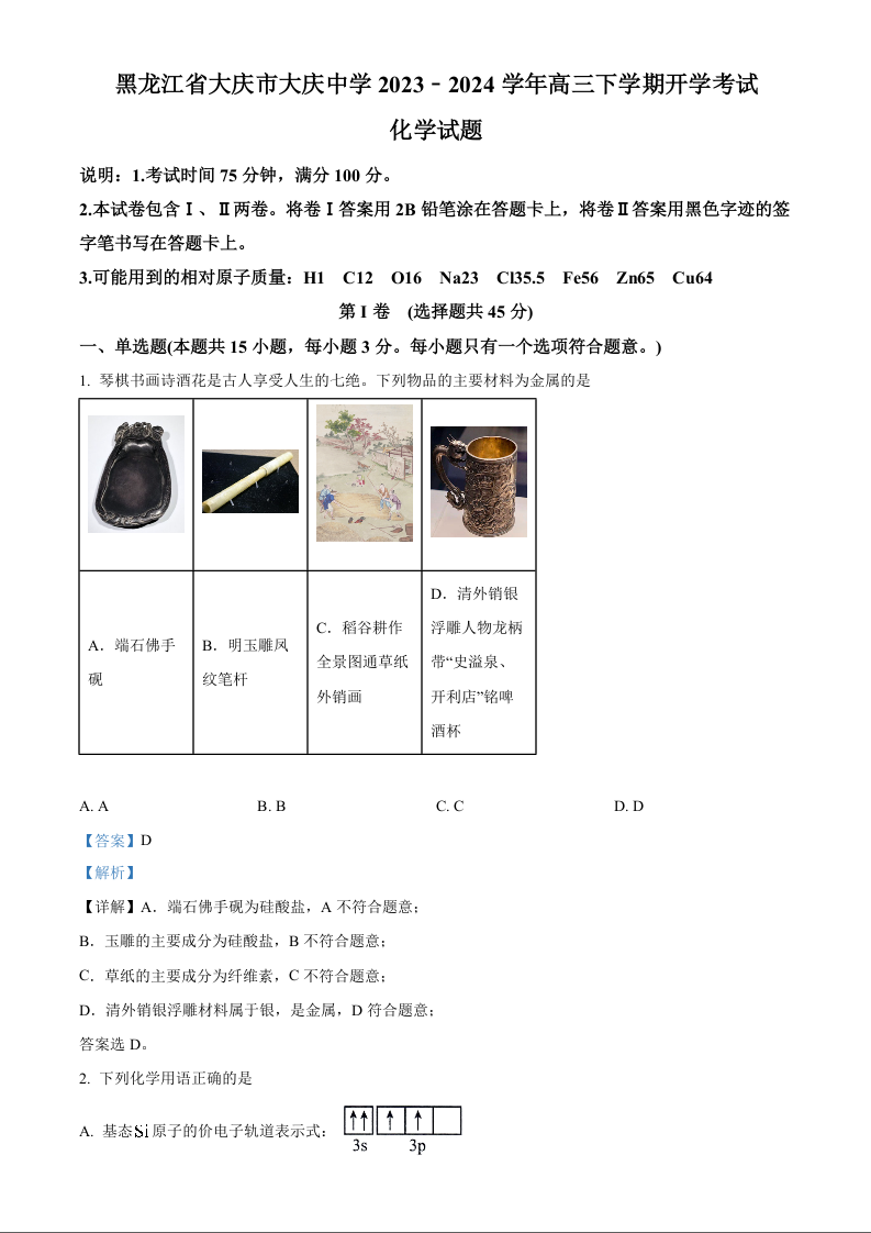 黑龙江省大庆市大庆中学2024届高三下学期开学考试化学(精品解析版)