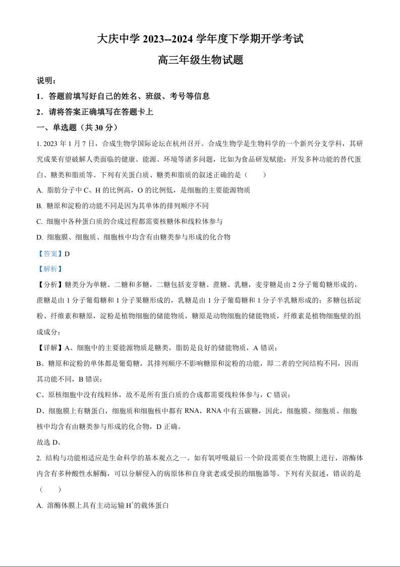 黑龙江省大庆市大庆中学2024届高三下学期开学考试生物(精品解析版)