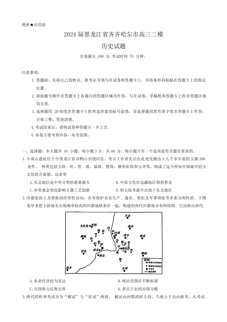黑龙江省齐齐哈尔市2024届高三下学期二模考试历史+答案