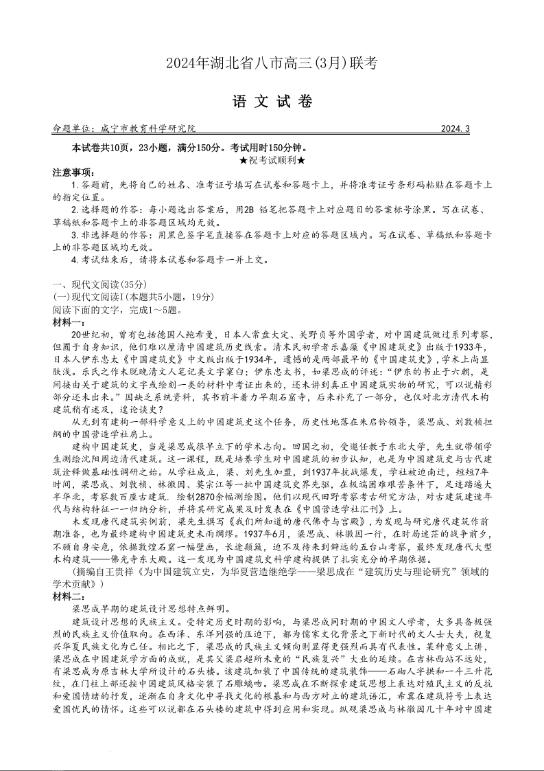 湖北省八市2024届高三下学期3月联考语文+答案