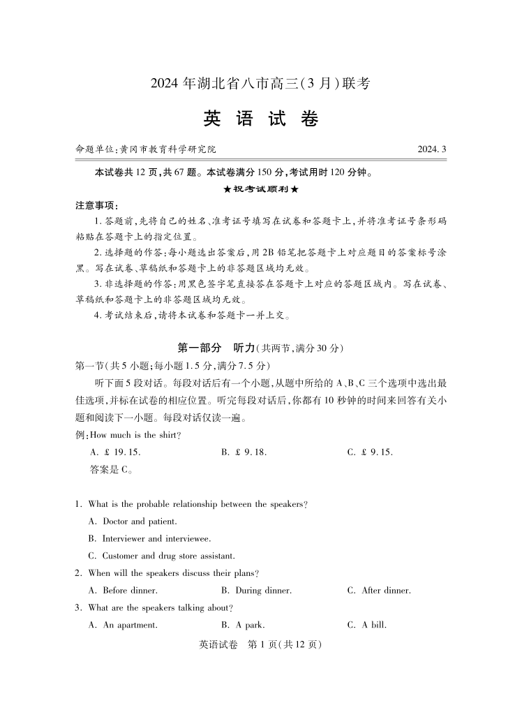 湖北省八市2024届高三下学期3月联考英语