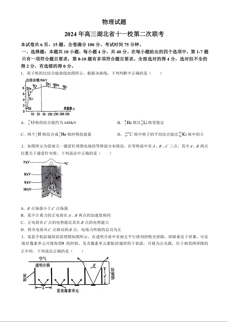 湖北省十一校2024届高三下学期第二次联考物理
