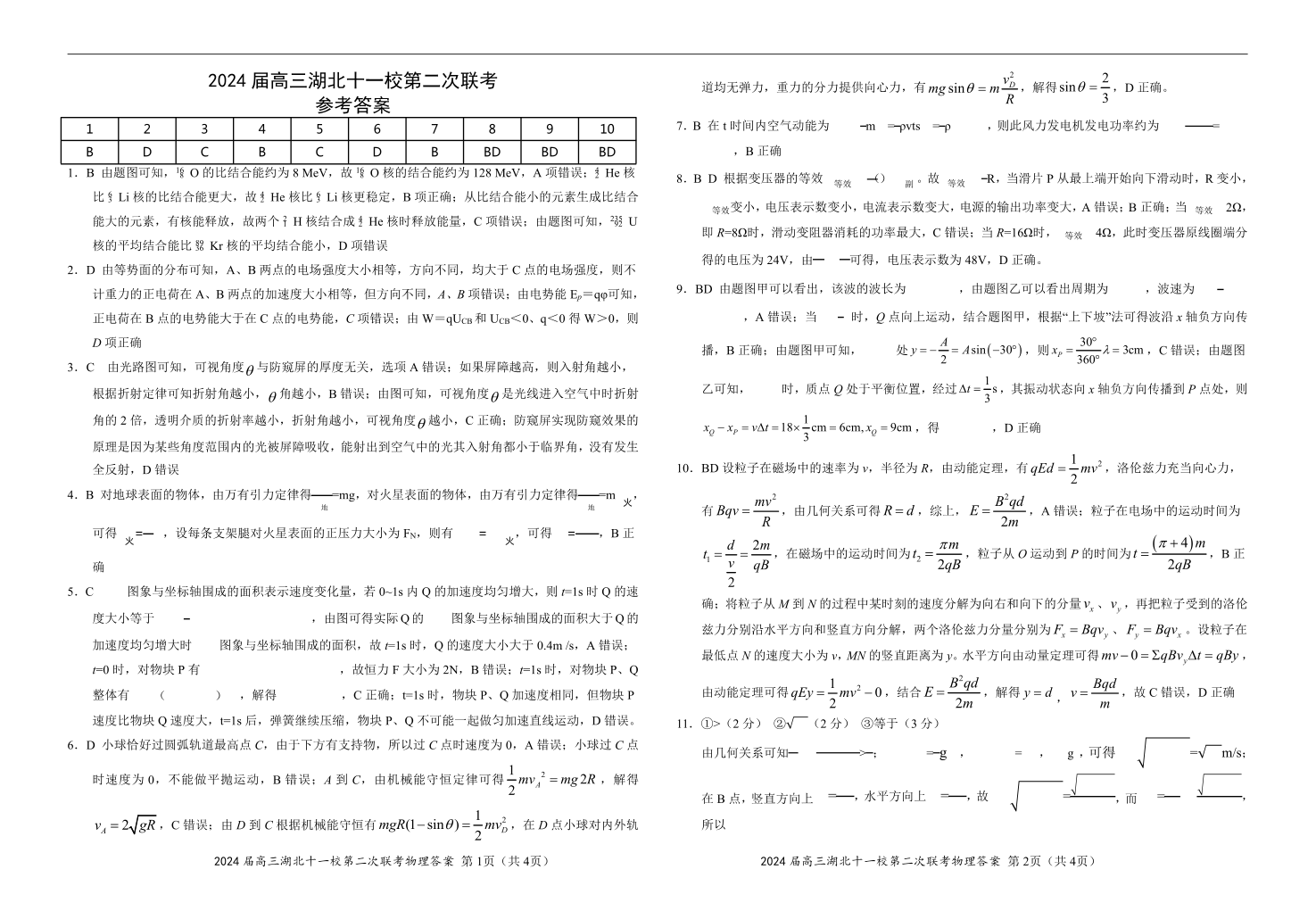 湖北省十一校2024届高三下学期第二次联考物理答案