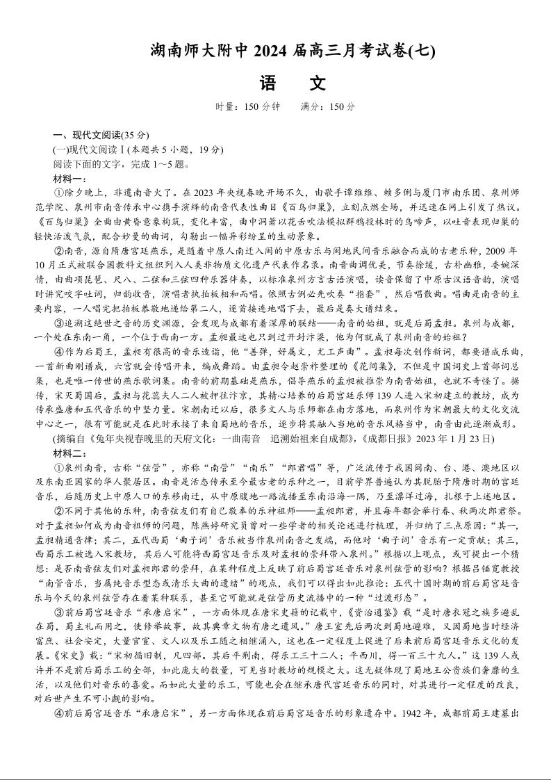 湖南省师范大学附属中学2024届高三月考(七)语文