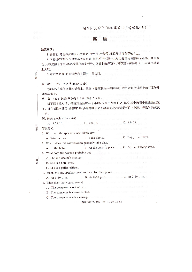 湖南省师范大学附属中学2024届高三月考(七)英语