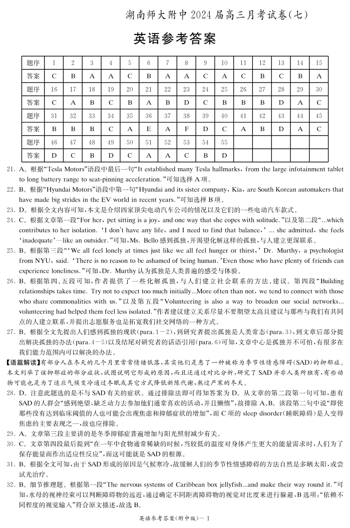 湖南省师范大学附属中学2024届高三月考(七)英语答案