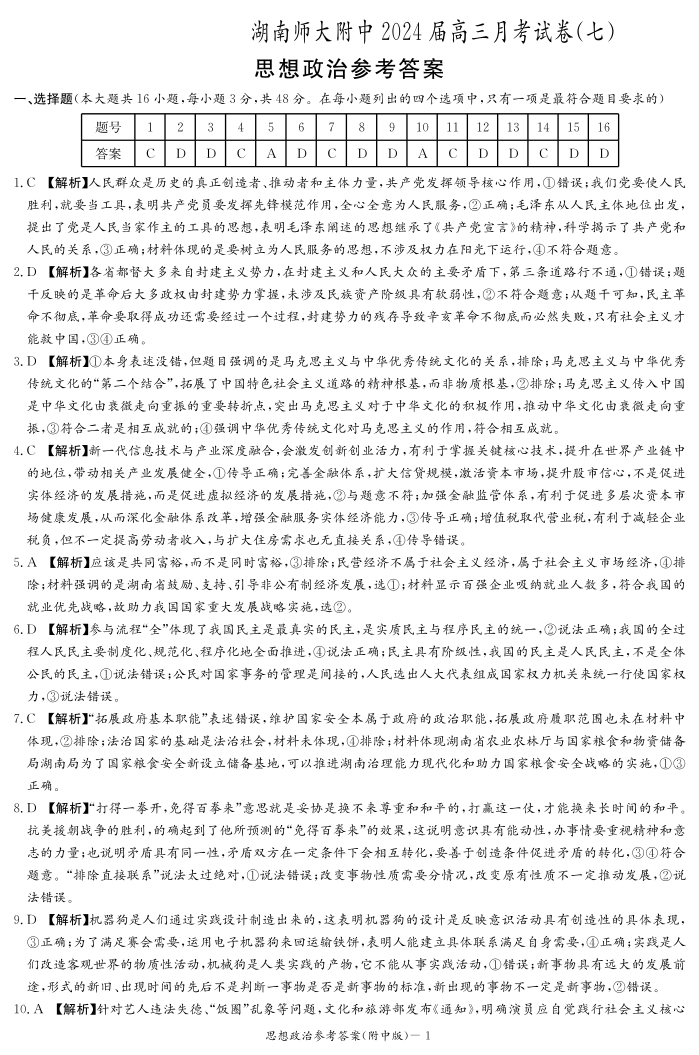 湖南省师范大学附属中学2024届高三月考(七)政治答案