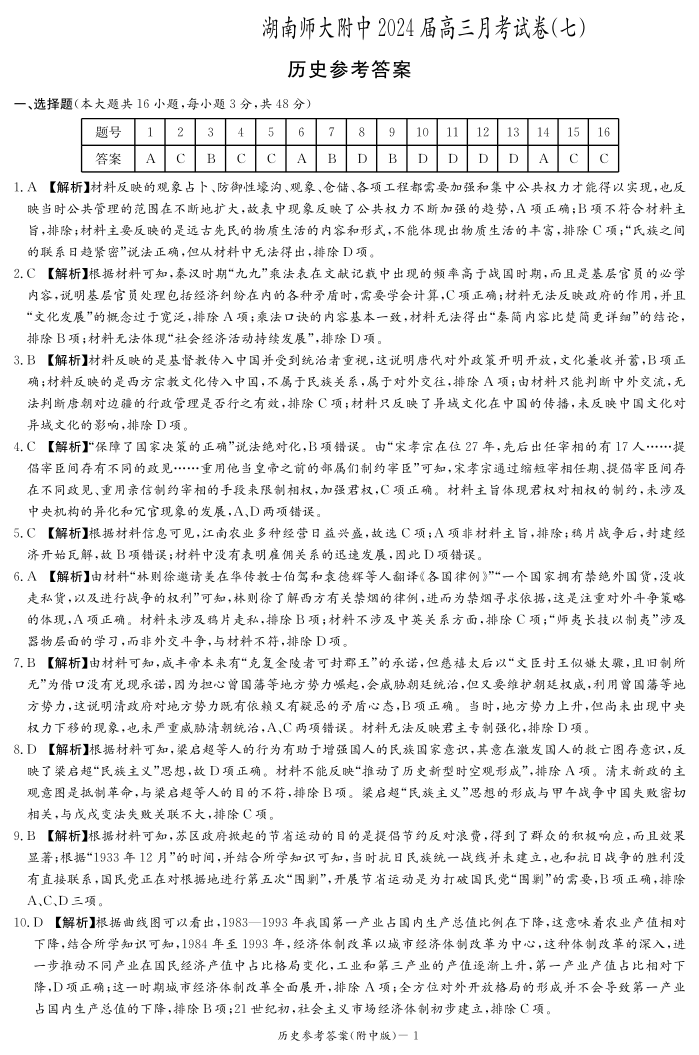 湖南省师范大学附属中学2024届高三月考(七)历史答案