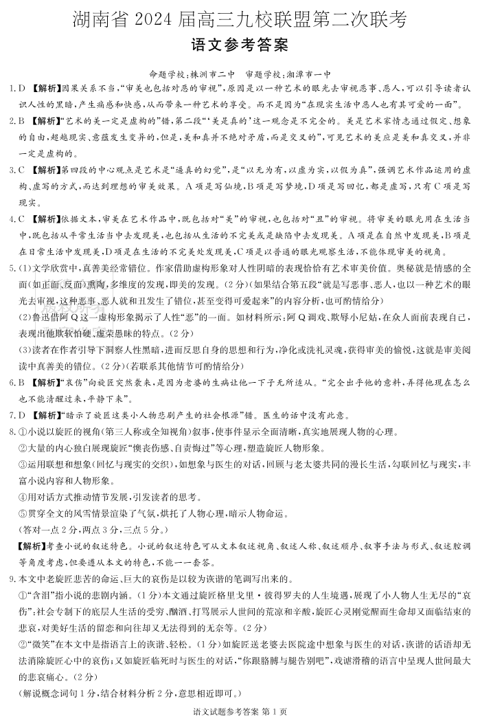 湖南省九校联盟2024届高三下学期第二次联考语文答案