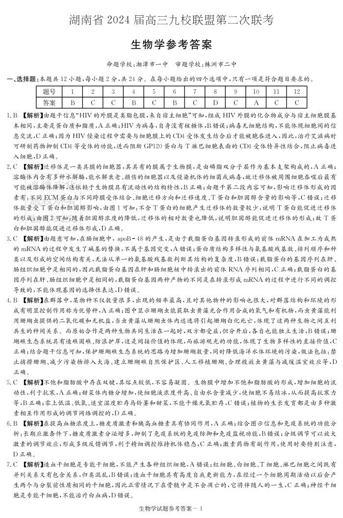 湖南省九校联盟2024届高三下学期第二次联考生物答案