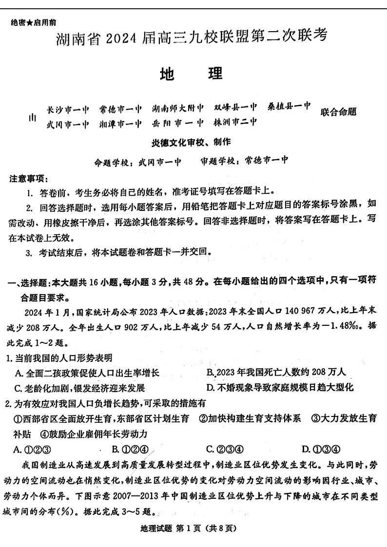 湖南省九校联盟2024届高三下学期第二次联考地理