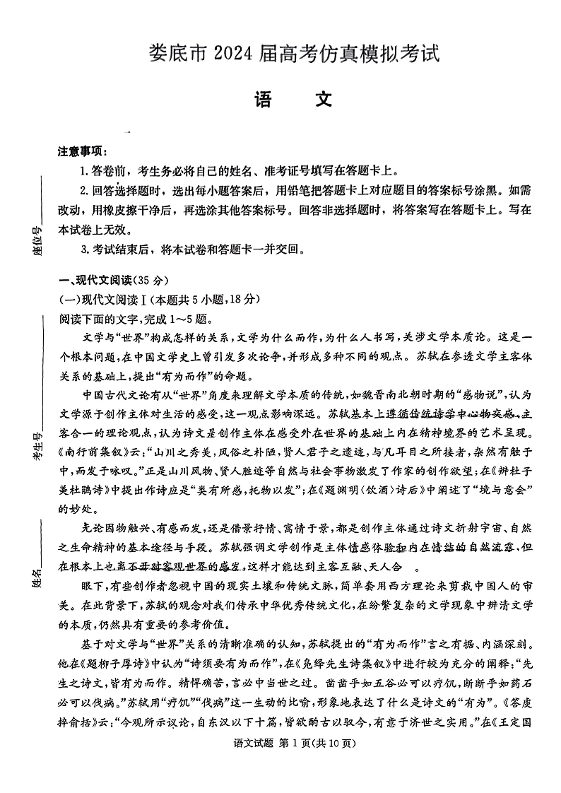 湖南省娄底市2024届高三下学期仿真模拟考试(娄底三模)语文