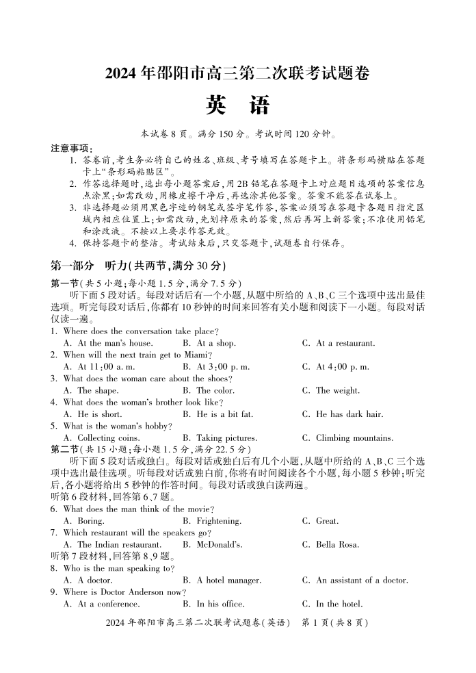 湖南省邵阳市2024届高三下学期二模(邵阳二模)英语