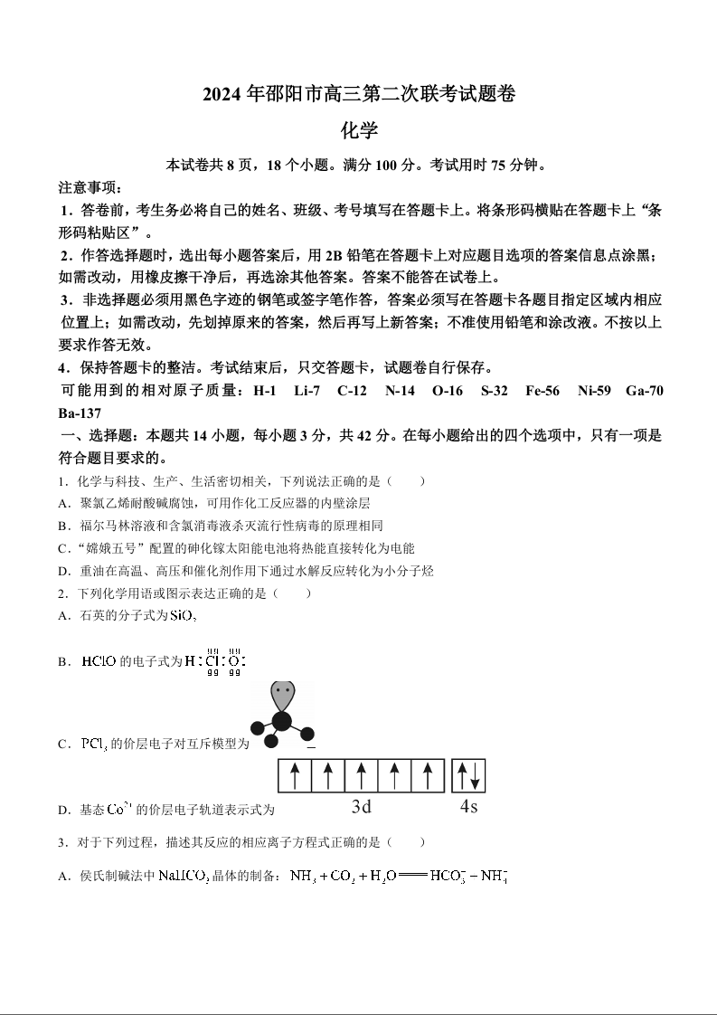 湖南省邵阳市2024届高三下学期二模(邵阳二模)化学+答案