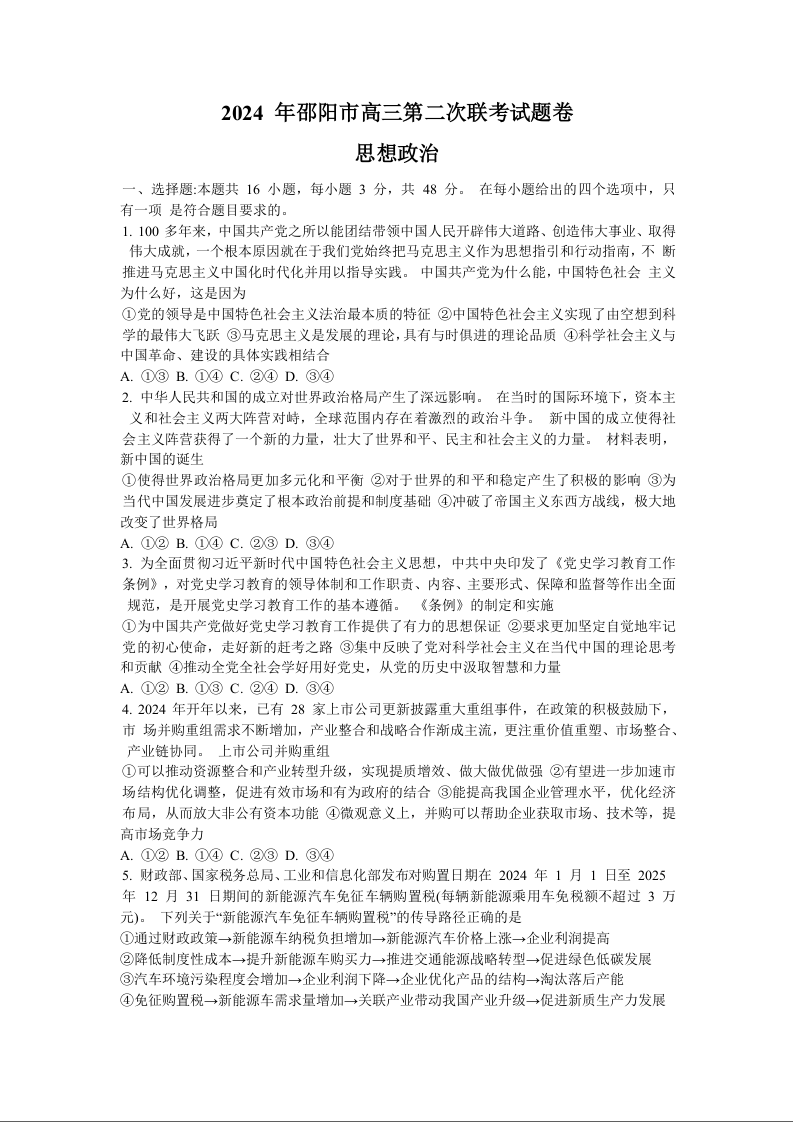 湖南省邵阳市2024届高三下学期二模(邵阳二模)政治+答案