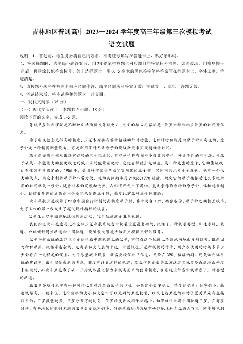 吉林省吉林地区2024届普通高中高三三模考试语文+答案