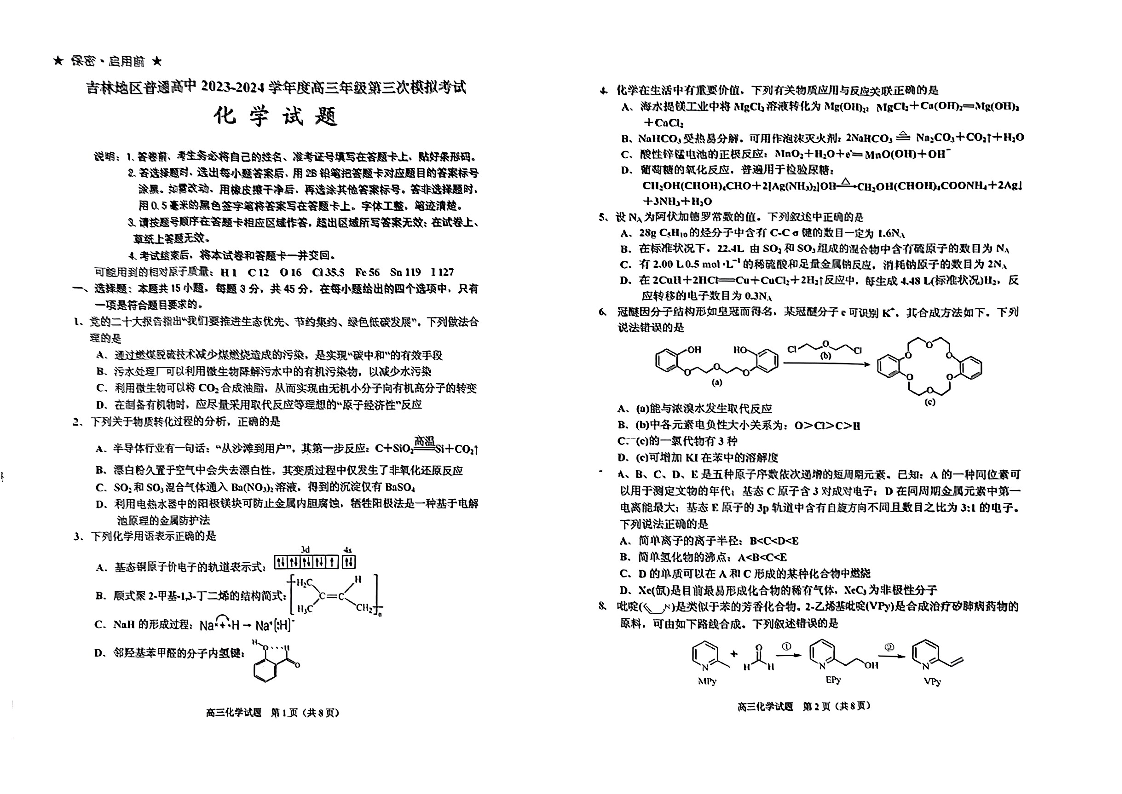 2024届吉林省吉林地区普通高中高三三模考试化学+答案