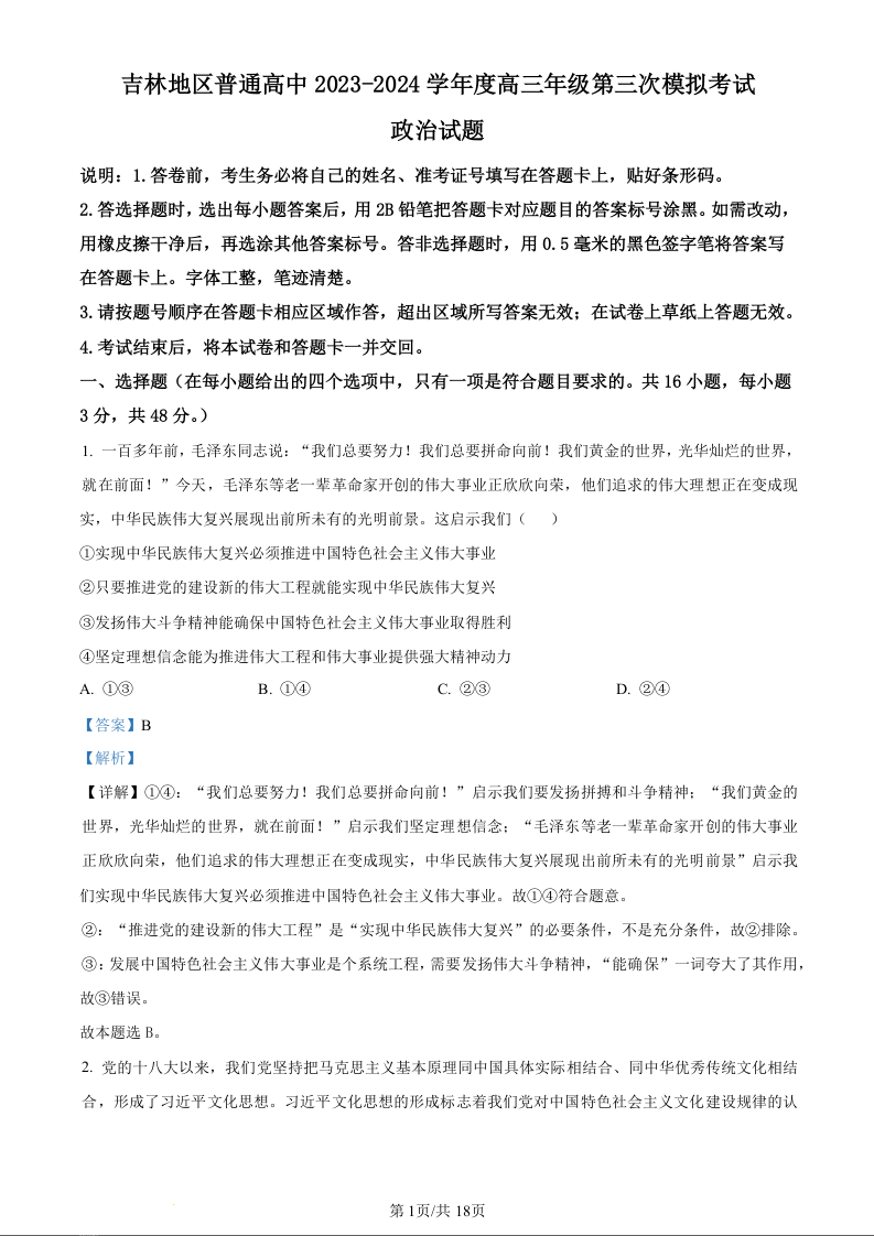吉林省吉林地区2024届普通高中高三三模考试政治(精品解析版)