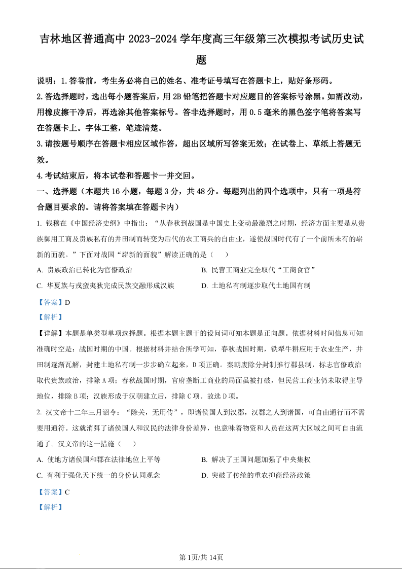 吉林省吉林地区2024届普通高中高三三模考试历史(精品解析版)