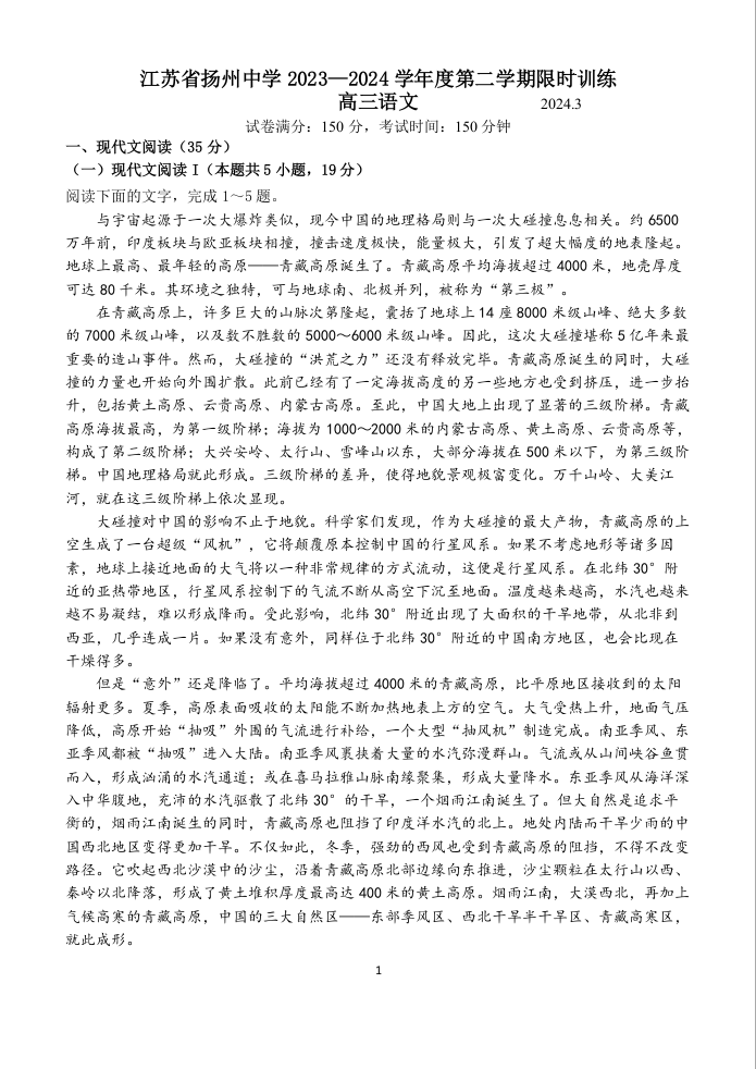 江苏省扬州中学2024届高三下学期阶段练习语文
