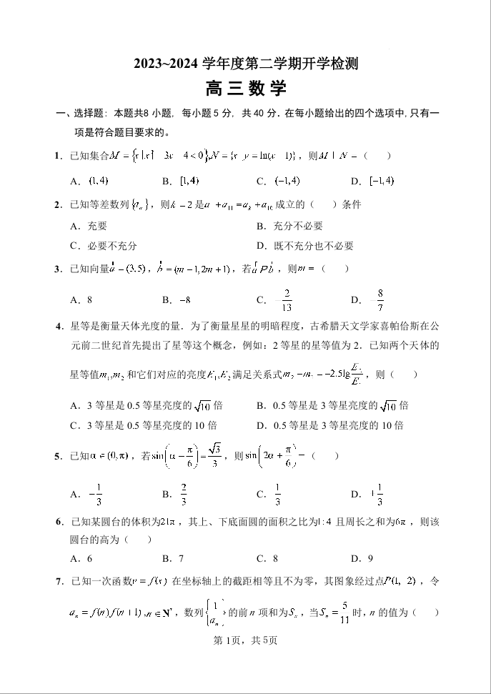 江苏省扬州中学2024届高三下学期阶段练习数学