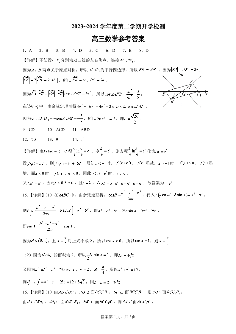 江苏省扬州中学2024届高三下学期阶段练习数学答案