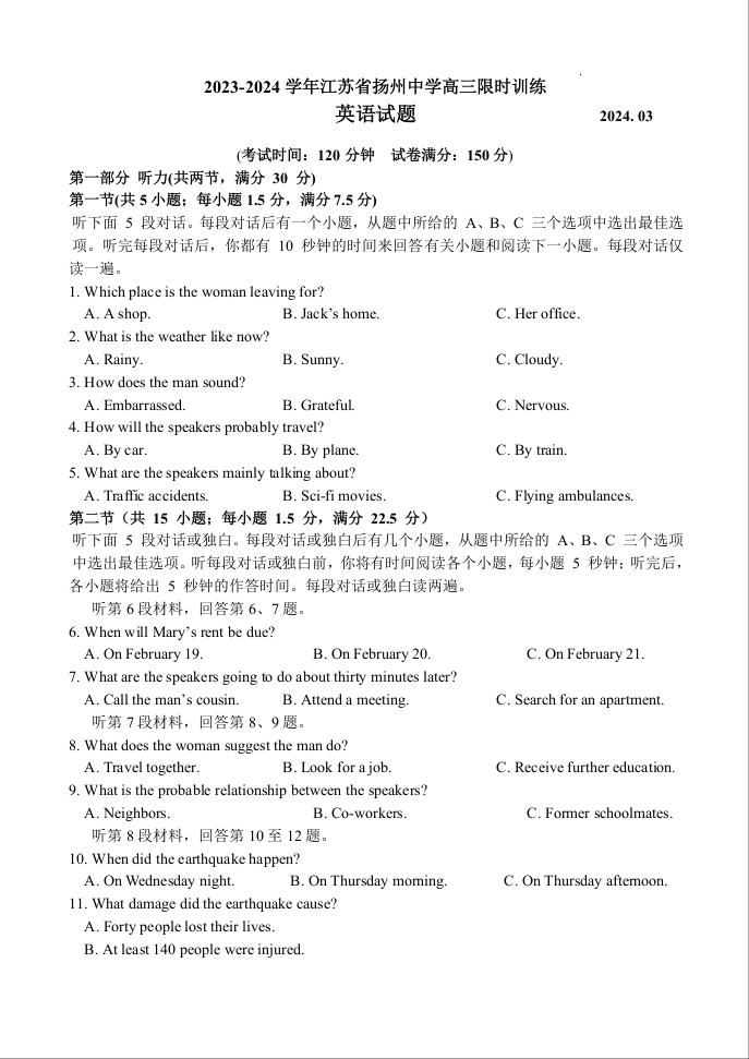江苏省扬州中学2024届高三下学期阶段练习英语