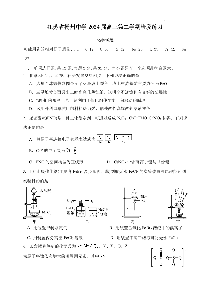 江苏省扬州中学2024届高三下学期阶段练习化学+答案