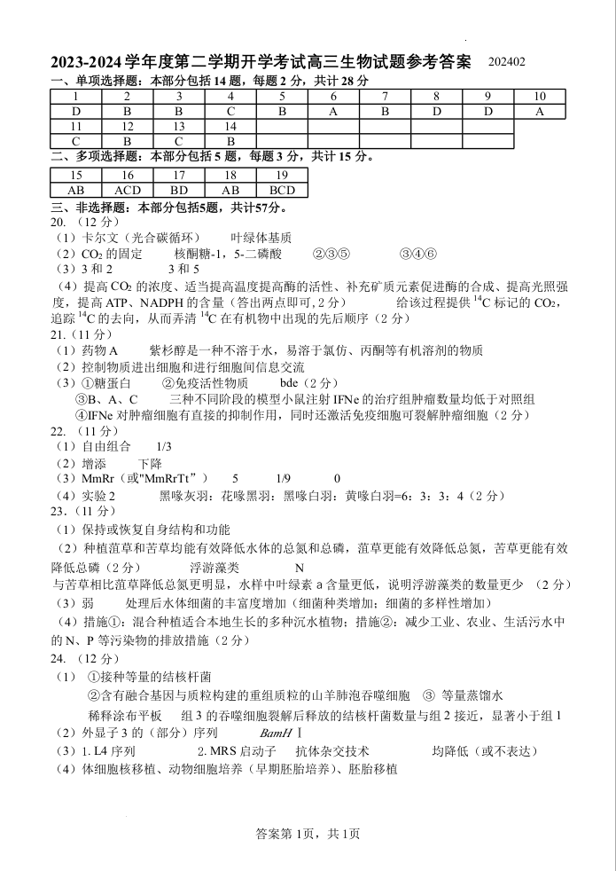 江苏省扬州中学2024届高三下学期阶段练习生物答案