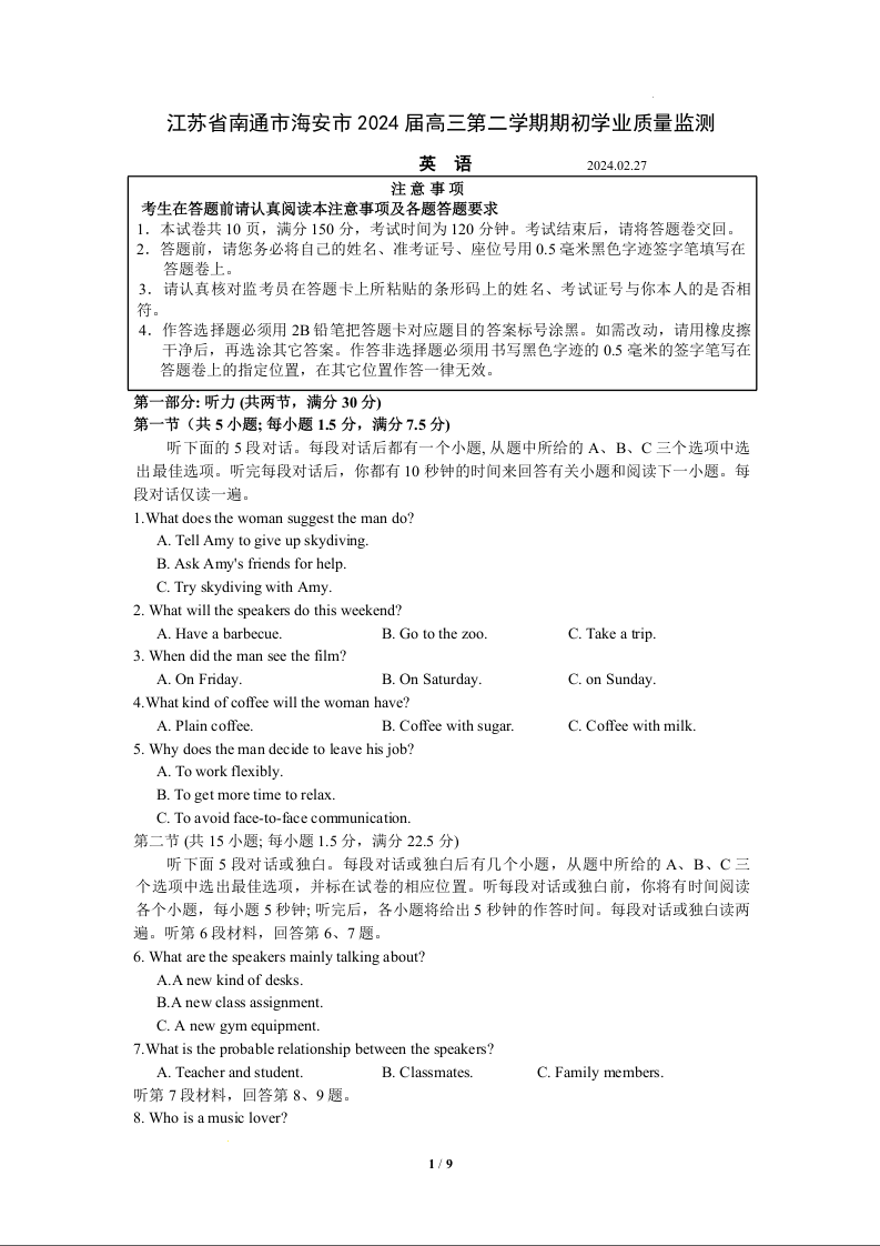 江苏省南通市海安市2024届高三上学期期初学业质量监测英语