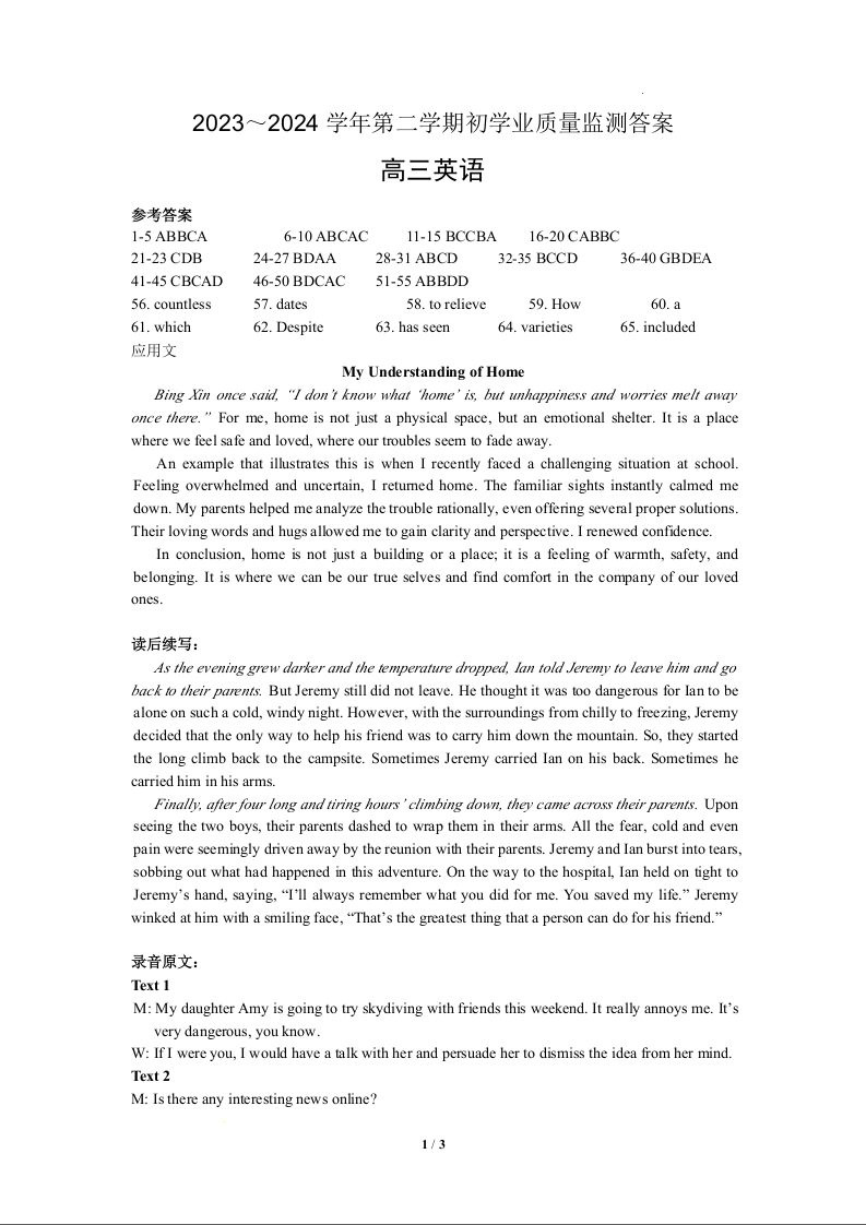江苏省南通市海安市2024届高三上学期期初学业质量监测英语答案