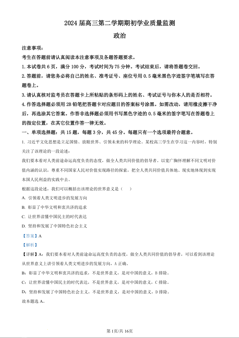 江苏省南通市海安市2024届高三上学期期初学业质量监测政治(精品解析版)
