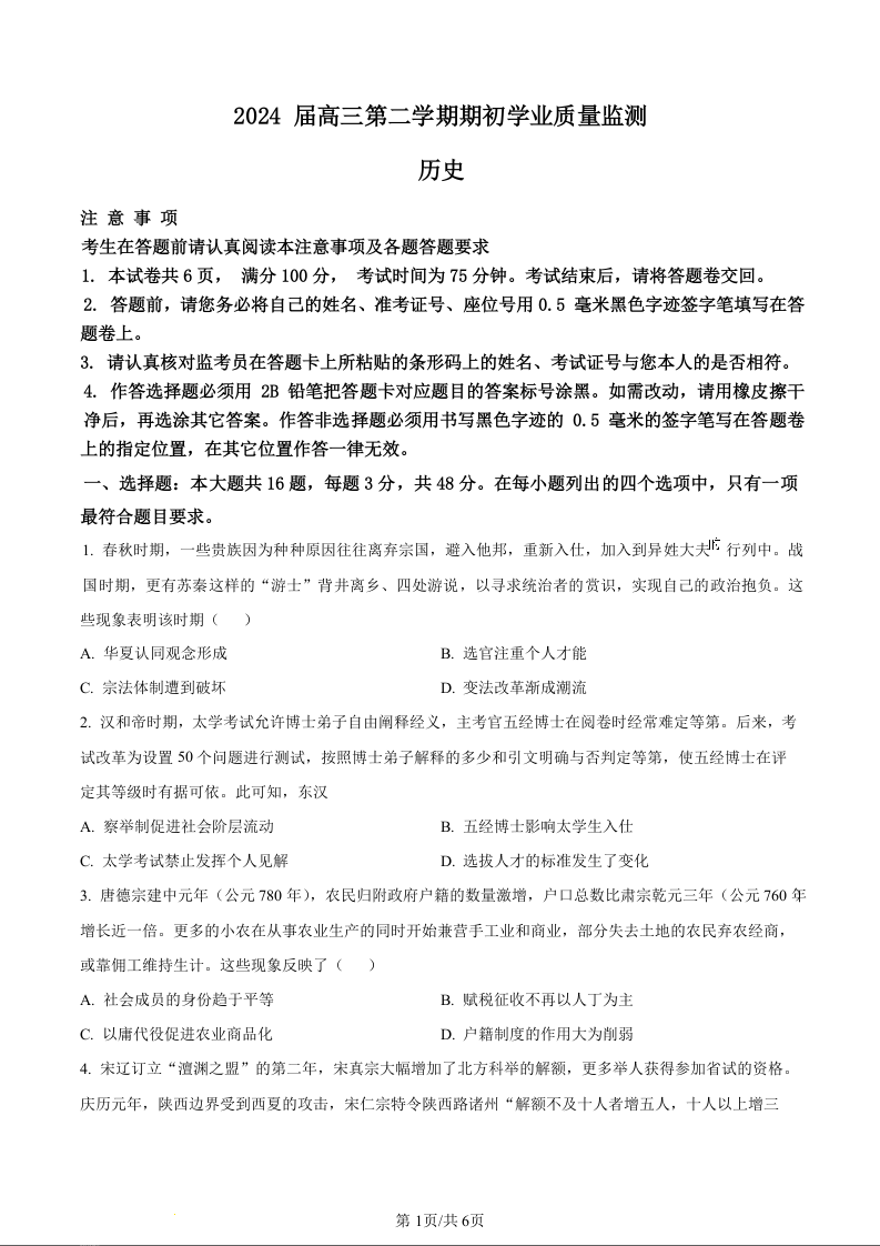 江苏省南通市海安市2024届高三上学期期初学业质量监测历史(原卷版)