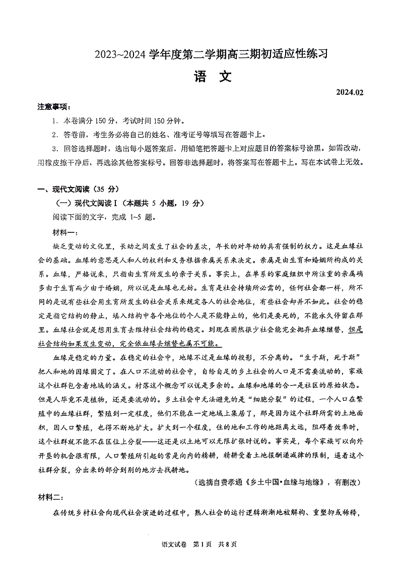 江苏省镇江市2024届高三下学期期初适应性练习语文+答案